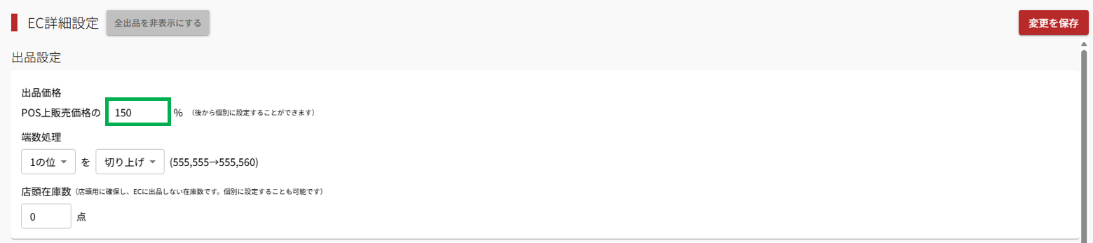 EC詳細設定から出品価格をまとめて設定することができます。POS上での販売価格との比率を入力することで、個別に設定がない商品についてはPOS上での販売価格に基づいて価格が決定されます。