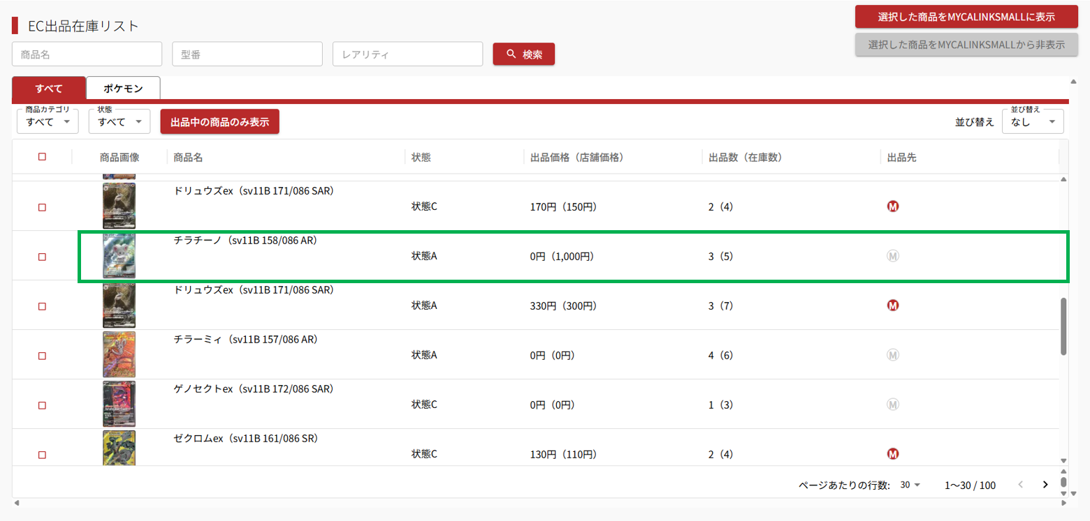 EC出品在庫リストから価格を変更したい商品を選択します。