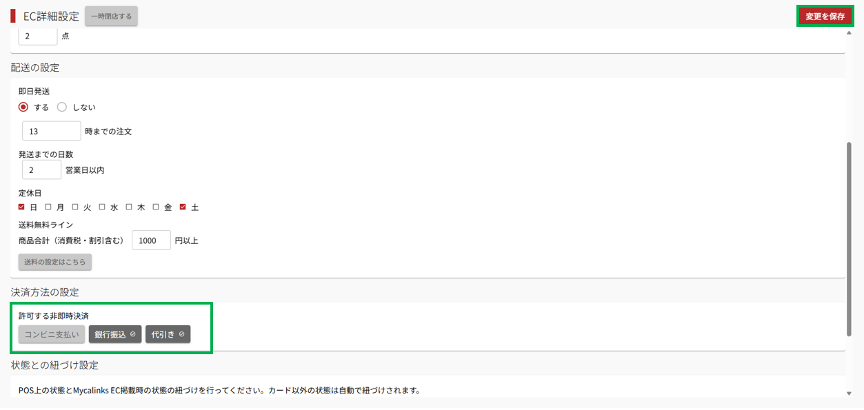 なお、ご利用可能な決済手段は店舗様側で選択・制限することが可能です。 設定はEC詳細設定の「決済方法の設定」から行うことができ、クレジットカード以外の非即時決済を選択することができます。