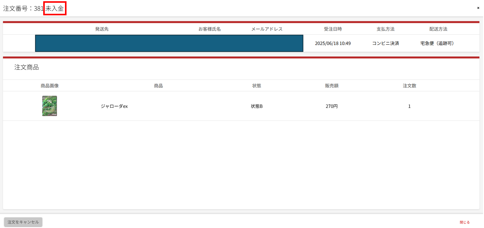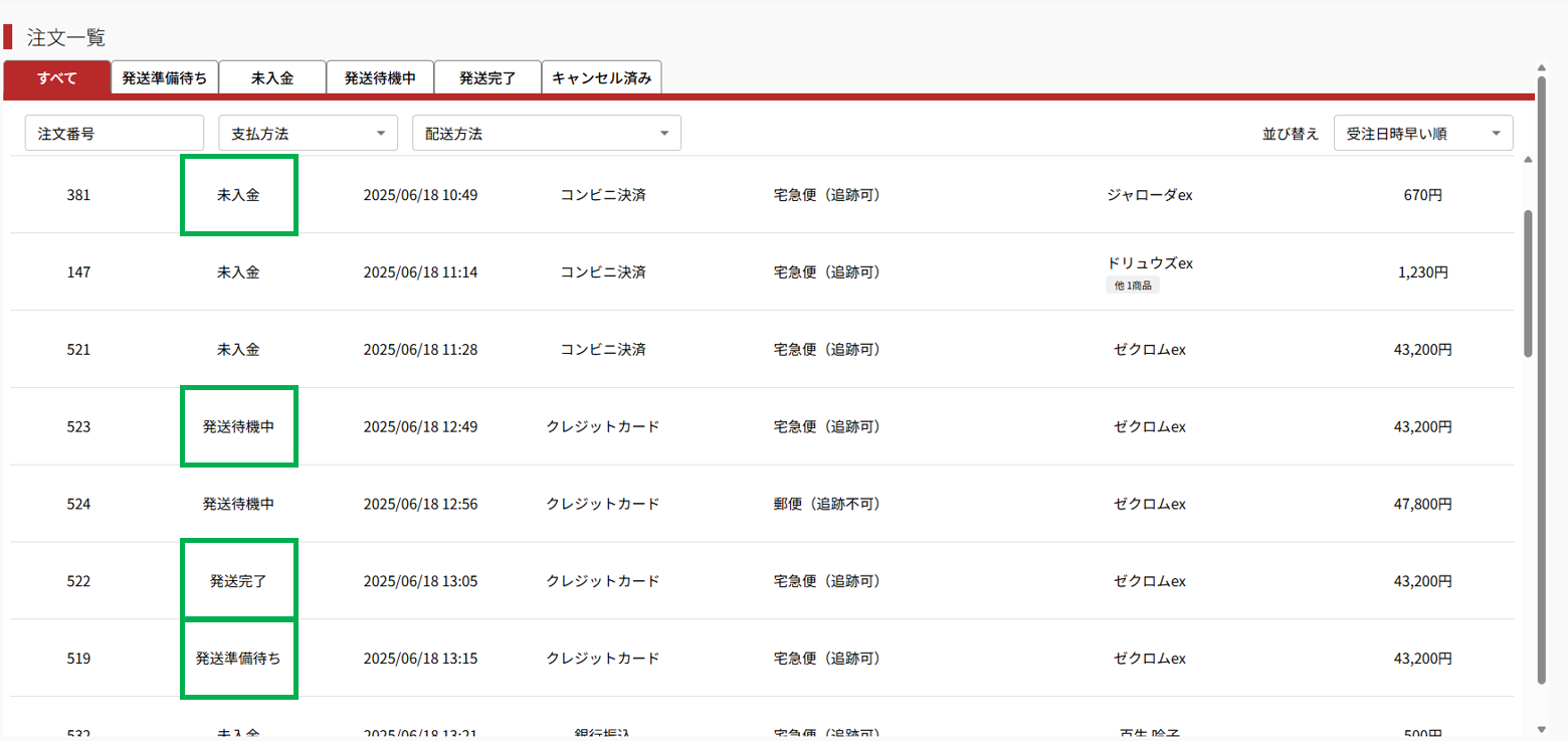 未入金: コンビニ支払いや銀行振込で、まだ入金が確認されていない注文です。これらの支払い方法で注文を受けたときにこのステータスになります。