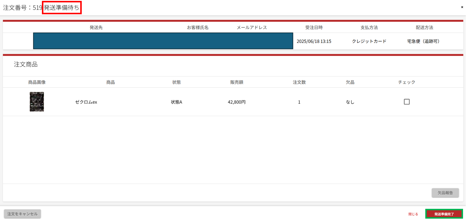 発送準備待ち: コンビニ支払いや銀行振込で入金が確認されたもの、およびクレジットカード決済や代金引換で、まだ発送準備が完了していない注文です。”未入金”のものが入金されたときに自動又は手動で変わるか、その他の販売方法で文を受けたときにこのステータスになります。