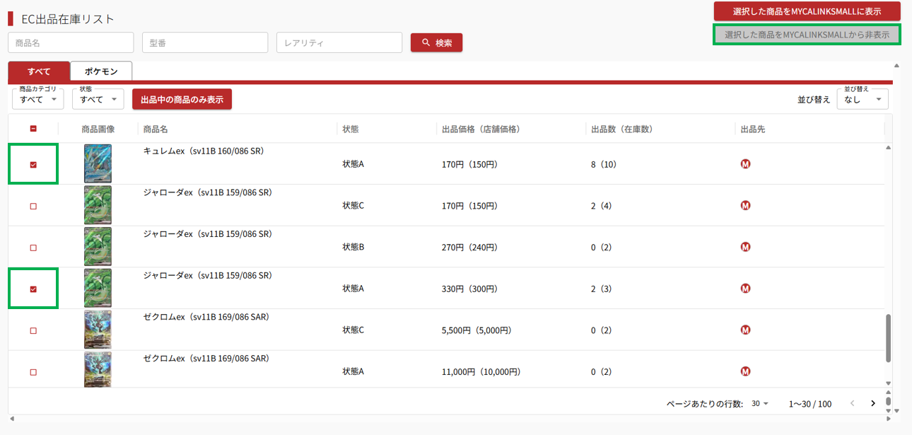 ECサイトへの出品を取り消すには、出品商品のMycalinks Mallへの非表示設定をする必要があります。