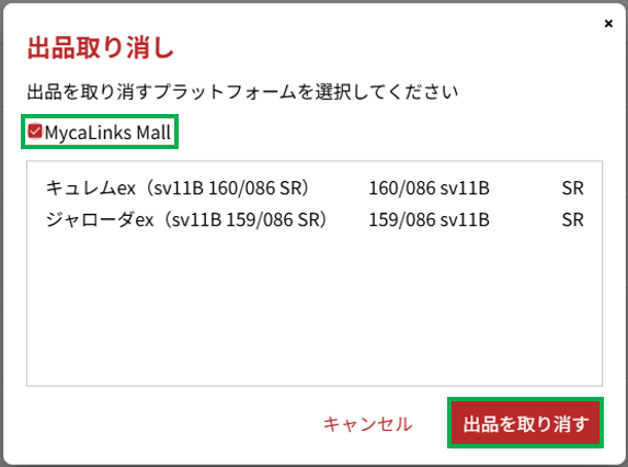 3.Mycalinks Mallにチェックをいれ、「出品を取り消す」を押します。
